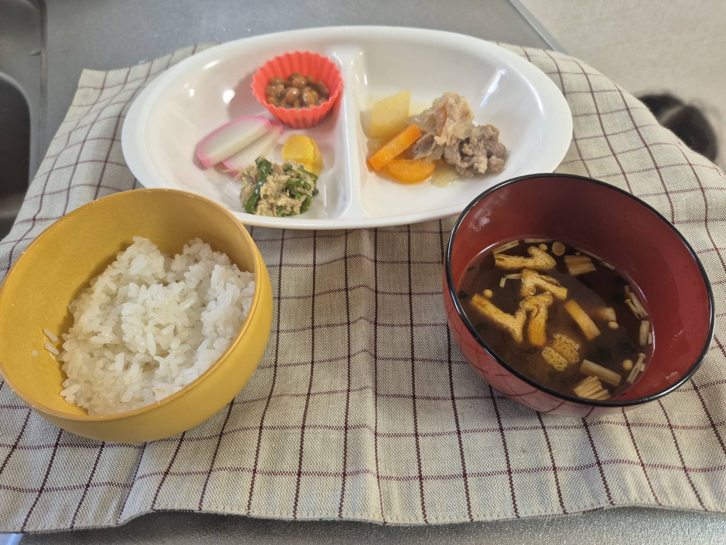 ご飯、豆腐と小松菜の味噌汁、豚肉とさつまいもの甘...