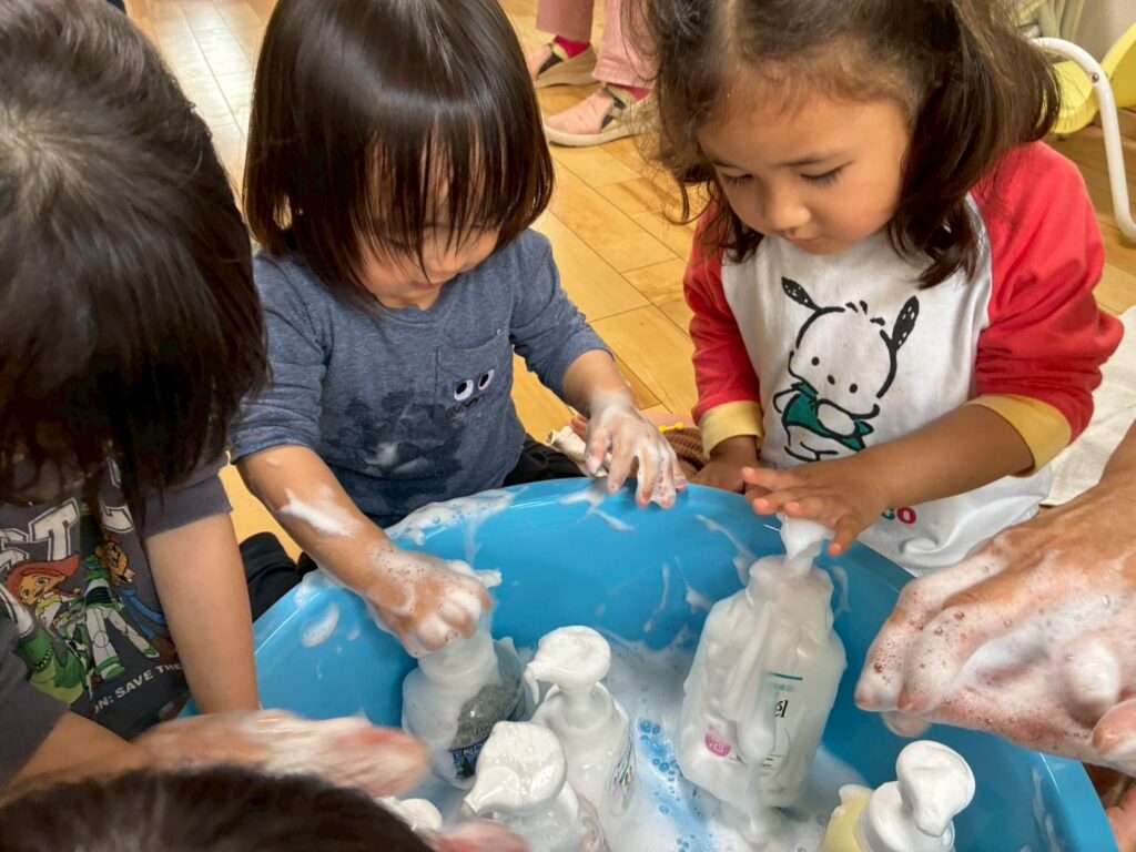 リトミックではかかしに挑戦!片足立ち出来たかな??お散歩に行って来たよ!!きれいなお花咲いてたかな?てんとう虫を見つけたよ!!午後は泡遊び♬いっぱい泡を出してとっても楽しかったよ✨