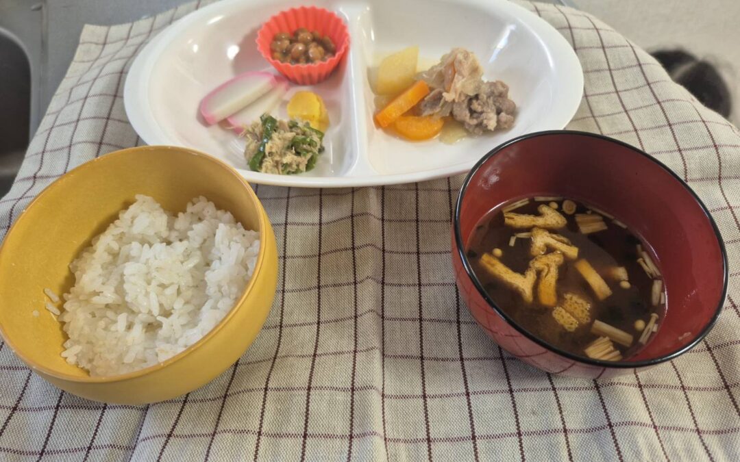 肉じゃが・・無限ピーマン・かまぼこ・たくあん・納豆・ごはん・味噌汁/せんべい、クッキー・ホームパイ